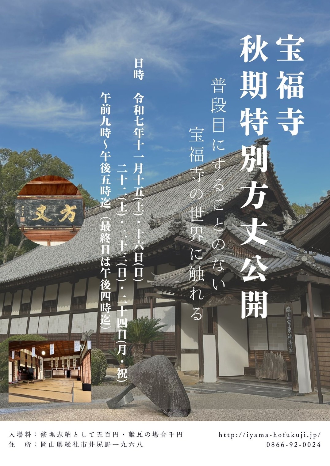 例年行なっていた「雪舟墨彩画展」に変わり、十一月の紅葉時に平素拝観をしていない内部、主に「方丈」を中心とした各部屋に、雪舟に関係したものやその他寺の什物を何点か展示し下記の如く一般公開を致します。